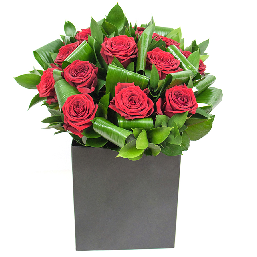 Celebrate beauty and uniqueness with our radiant red roses bouquet. This stunning arrangement combines passionate red roses with lush aspidistra leaves and delicate ruscus, creating a captivating display that enhances any space.