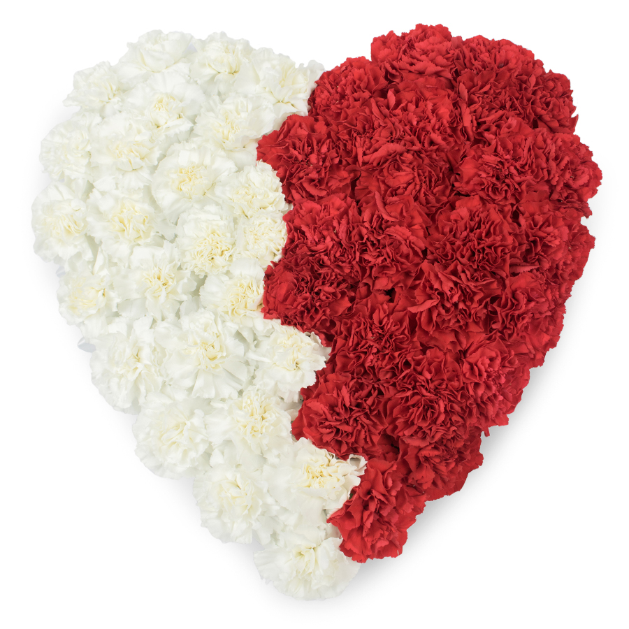 Celebrate the unique beauty of our heart-shaped mixed carnations arrangement, featuring a stunning combination of white and red carnations. Each bloom is hand-picked to ensure ultimate freshness and quality.