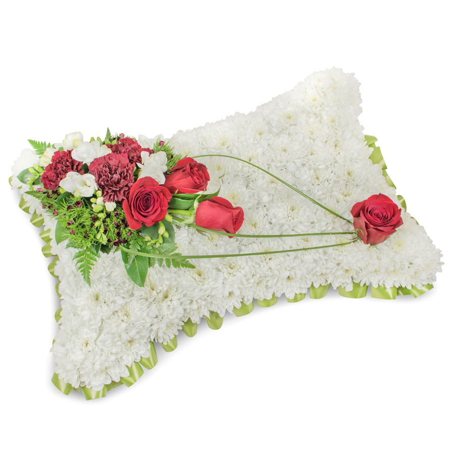 Express your heartfelt condolences with our refined sympathy bouquet, expertly crafted to provide comfort and express your deepest sympathies. This elegant arrangement features a harmonious blend of white chrysanthemums, bold red roses, sweet white freesias, rich dark red carnations, delicate dianthus, and bear grass, creating a beautiful and serene display.
