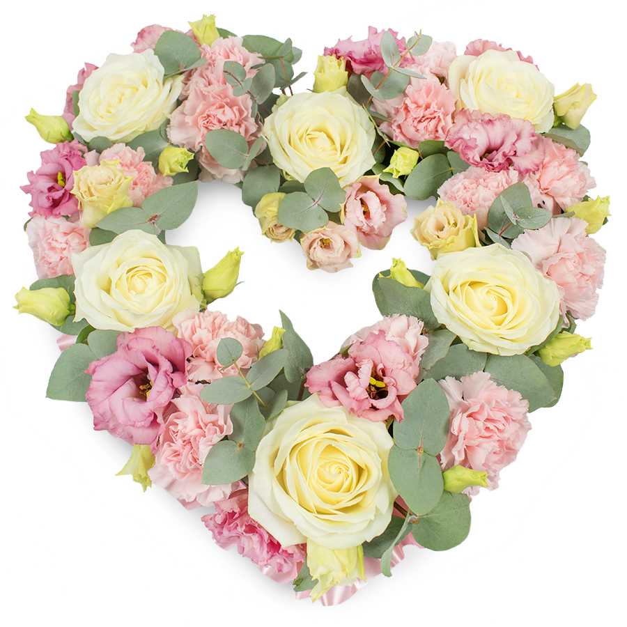 Show your deep appreciation and remembrance with our Timeless Heart Tribute Bouquet. This beautiful arrangement features a sophisticated mix of white roses, pink carnations, delicate pink lisianthus, and fragrant eucalyptus, all thoughtfully combined to create a meaningful tribute.